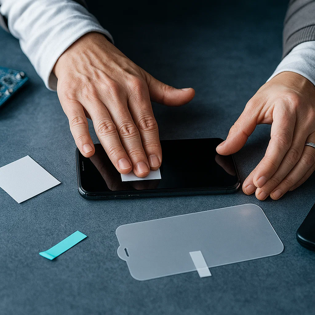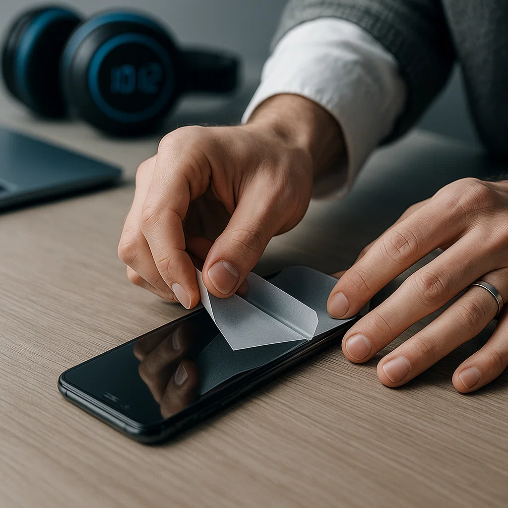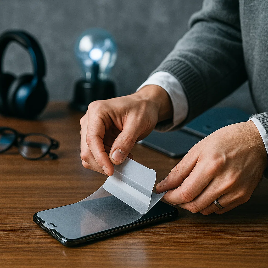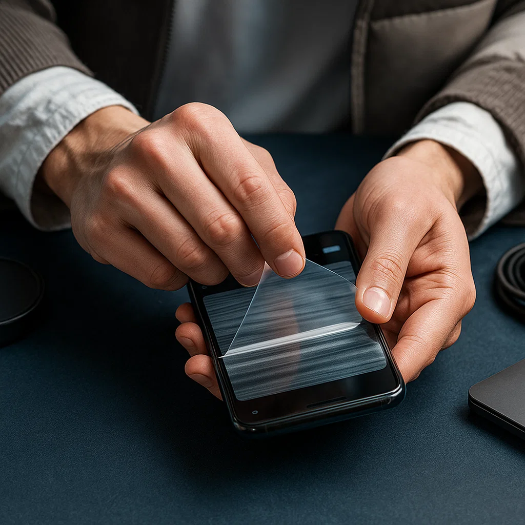- Retira la película protectora de la parte superior de la mica de hidrogel.